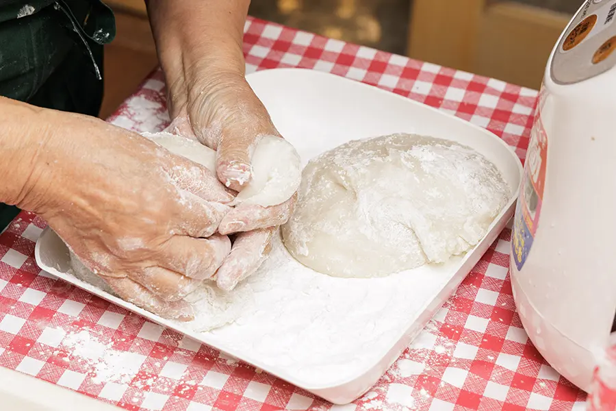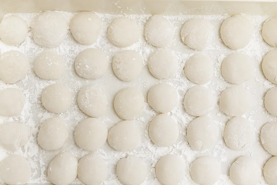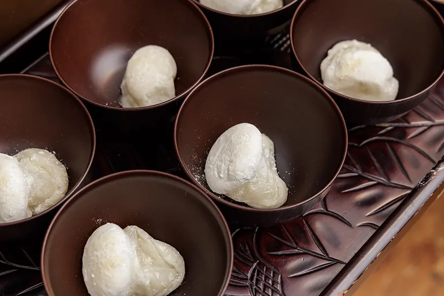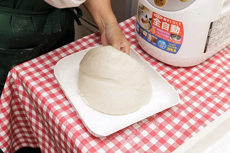 (1)つきたての餅を使う場合は、餅取り粉をまぶして丸めておく。