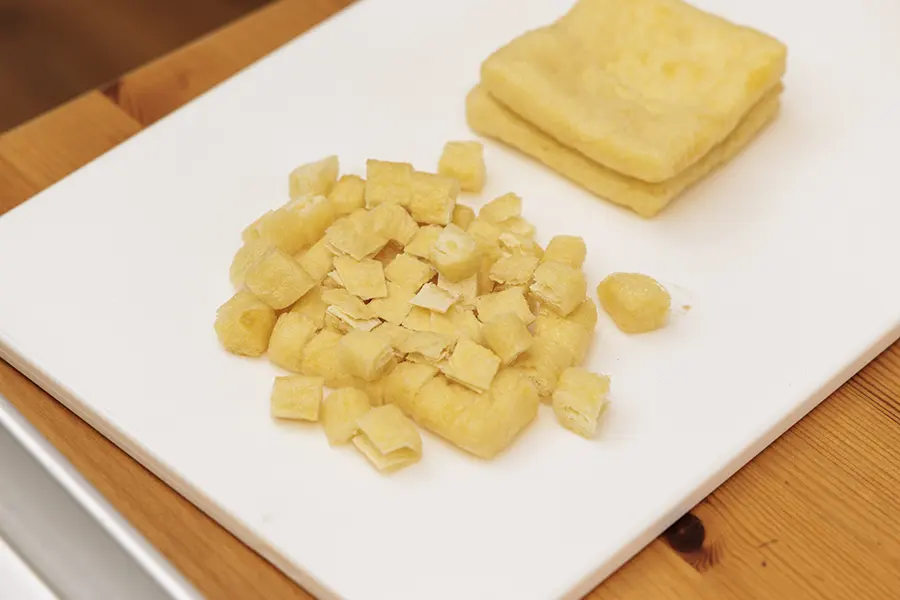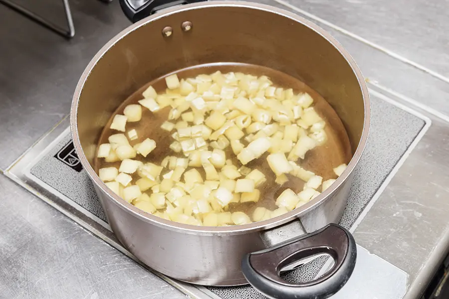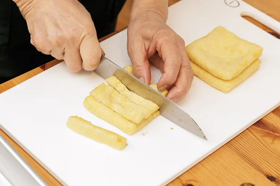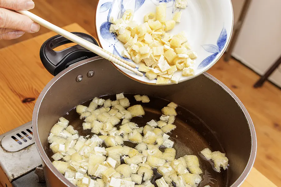 (4)鍋に出汁とうす揚げを入れて煮立たせる。