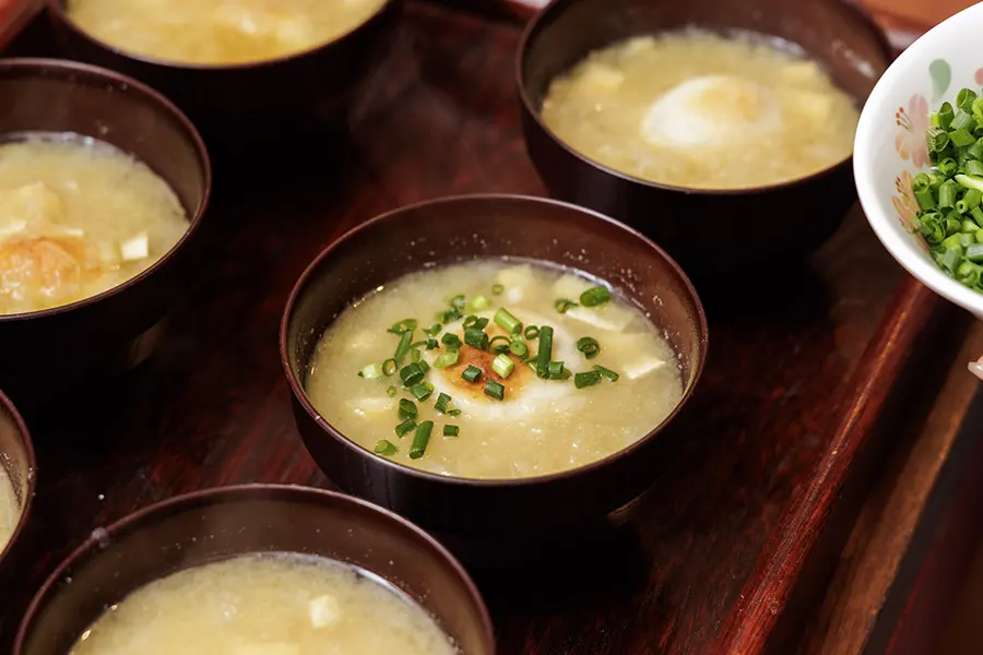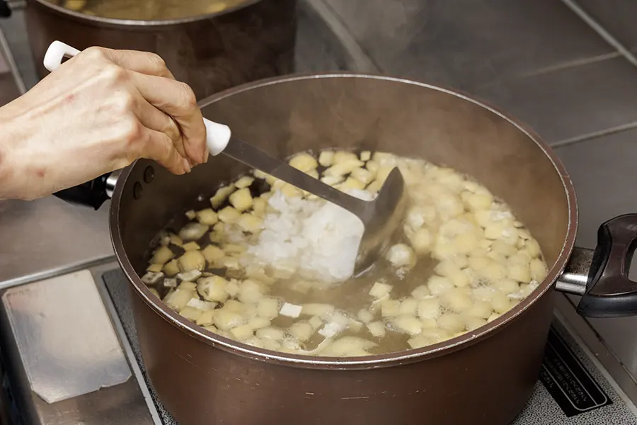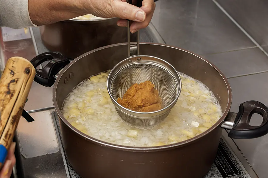 (7)合わせ味噌を(6)に溶き入れ、沸騰寸前で火を止める。