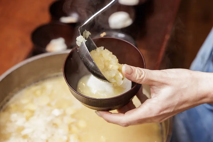 窯業で栄えた有田町の、冬の窯場で親しまれてきた味噌汁です。窯場では焼き物を焼成するために「窯焚き」が始まると、薪をくべながら幾日にもわたって燃やし続けます。その作業の夜食として「雪のつゆ」は振る舞われ、窯場で働く職人たちに喜ばれていました。名前の由来は、粗くすりおろした大根が雪やみぞれのように見えることから。当時は余裕のある窯元だけが餅入りを食べていたそうです。食感も風味もしっかりとした甘い冬大根と、まろやかな味噌が調和し、心身をやさしく温めてくれます。