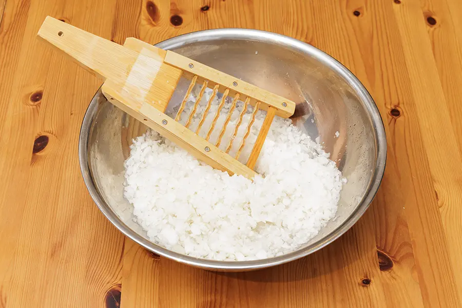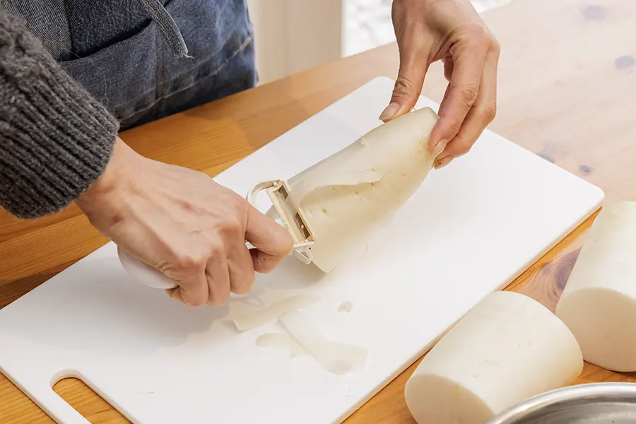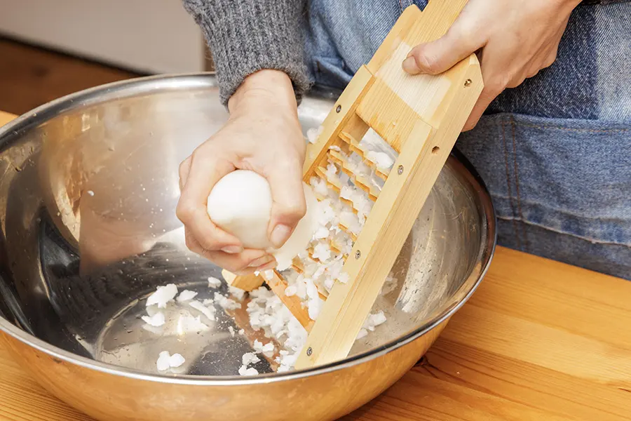 (2)大根の皮をむき、おろしばた(鬼おろし)で粗くすりおろす。