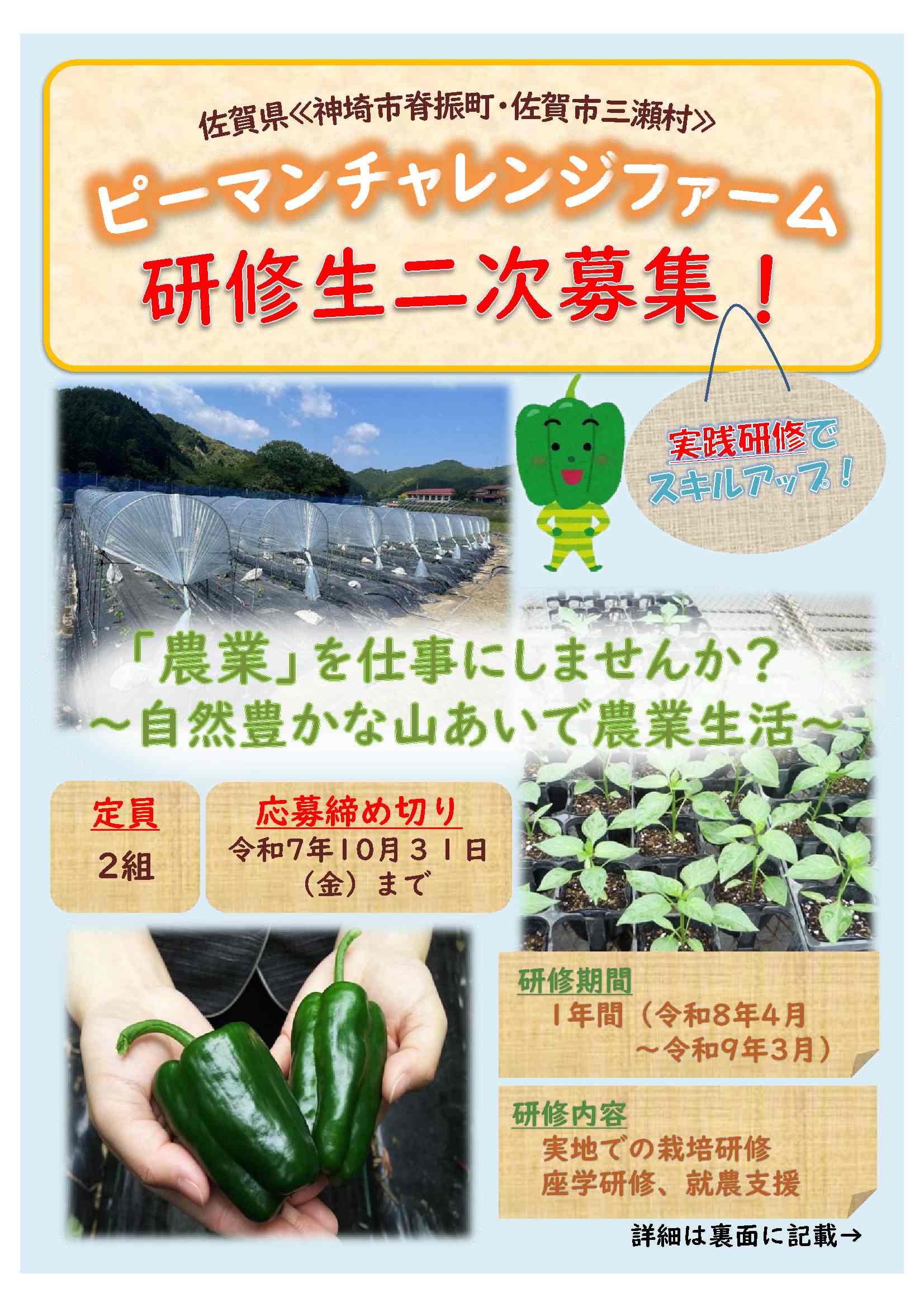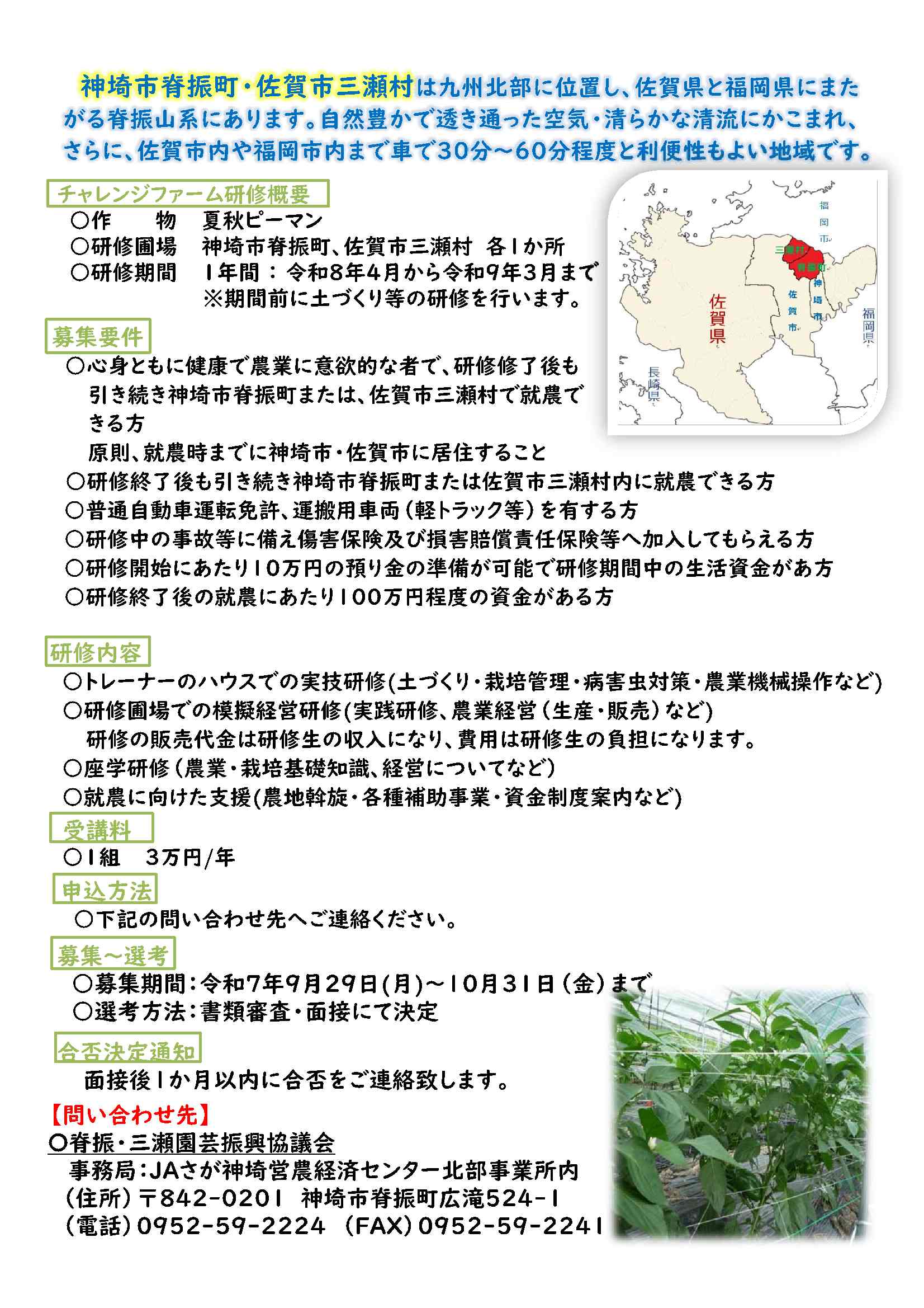 心身ともに健康で農業に意欲的な方で研修終了後も引き続き神埼市脊振町または佐賀市三瀬村で就農できる方を募集しています。