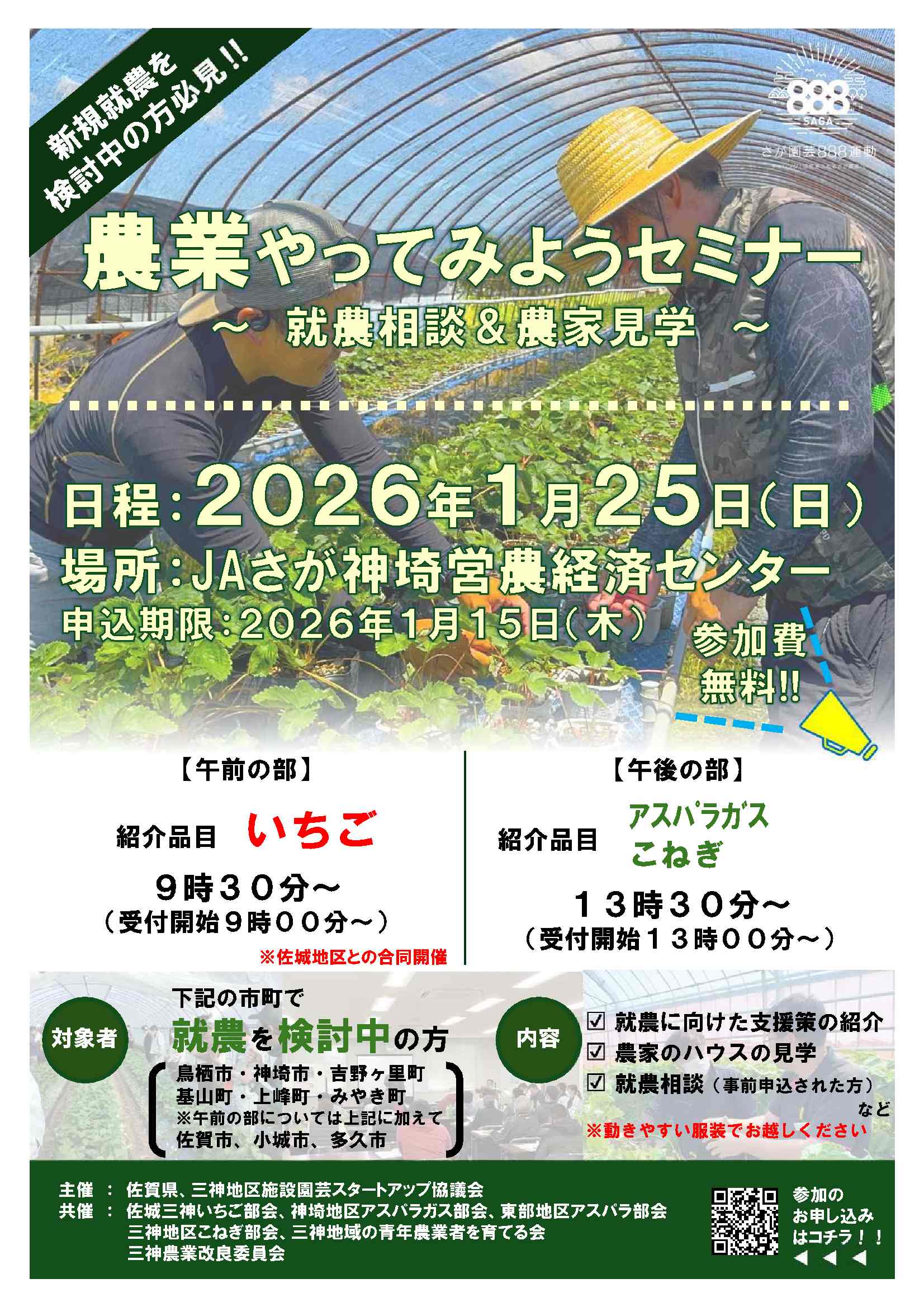 佐賀県三神地域の農業の魅力を知ってもらうため、「農業やってみようセミナー」を開催します。