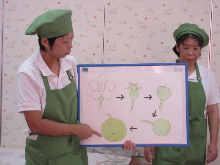 梨の紙芝居は伊万里のなし万里くんが出てきたお話で、とっても分かりやすく梨の収穫までが書いてあったよ。
