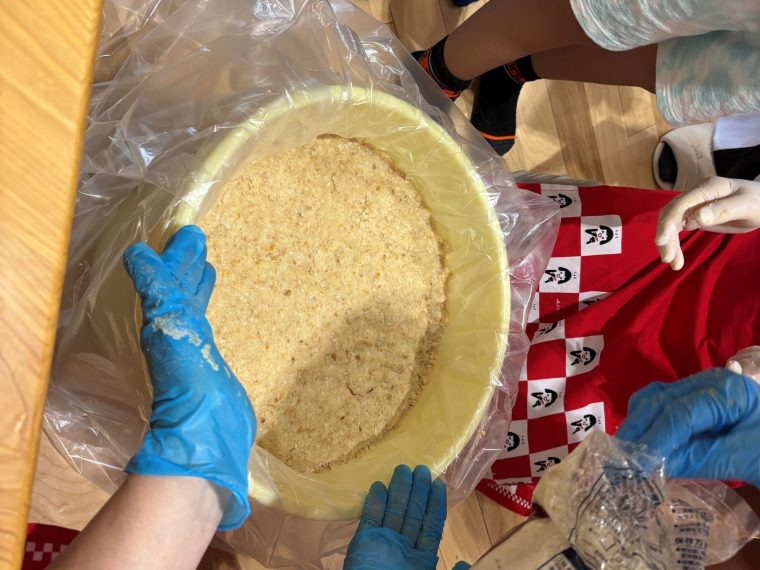 つぶした大豆と麹をタライに合わせて混ぜていきます。