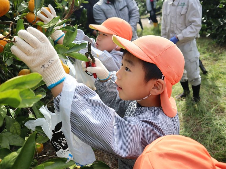 収穫したてのみかんを早速食べ、あまりのおいしさにたくさんの笑顔がこぼれていました。
