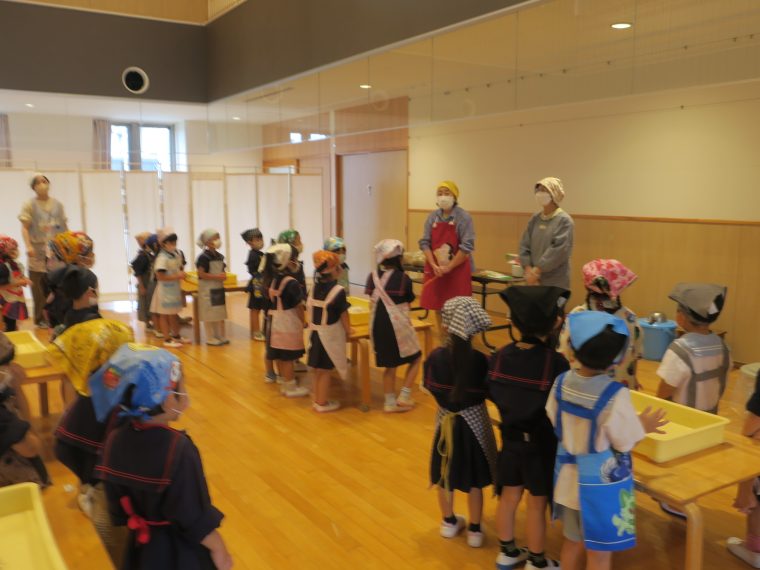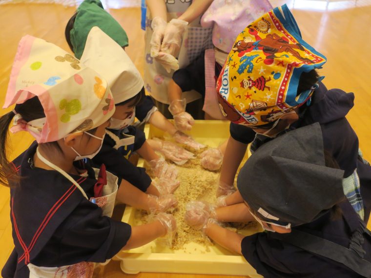 10月末にふるさと先生に来ていただき、年中さんみんなで味噌作りを行いました!初めて触る大豆や麹に興味津々な子どもたち✨混ぜた材料を容器に丸めて入れて味噌の完成!しっかり寝かせて完成する日を楽しみにしています🎵