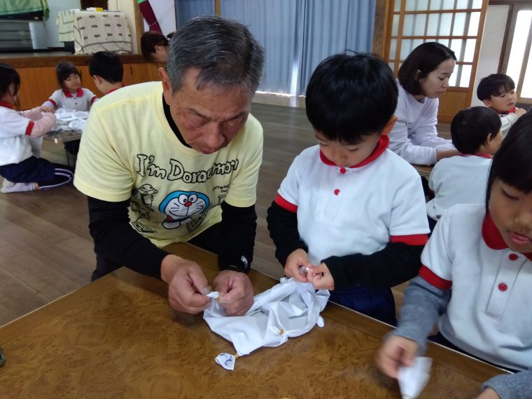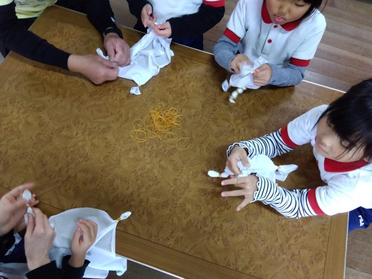 子ども達のハンカチに輪ゴムを結ぶ作業は出来上がりの想像をしながら楽しく手伝ってくださいました。