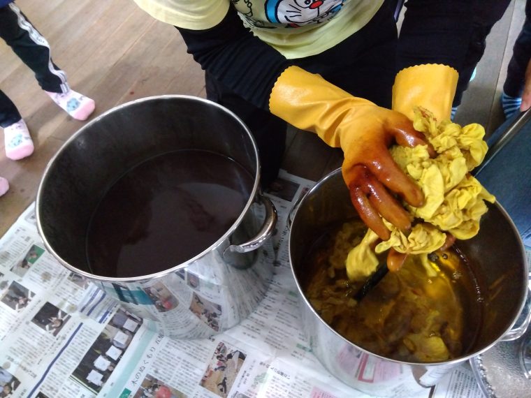 玉ねぎの皮の染料に浸した後、ミョウバン液につけて色を定着させ、鮮やかな黄色になると子ども達から歓喜の声が上がりました。