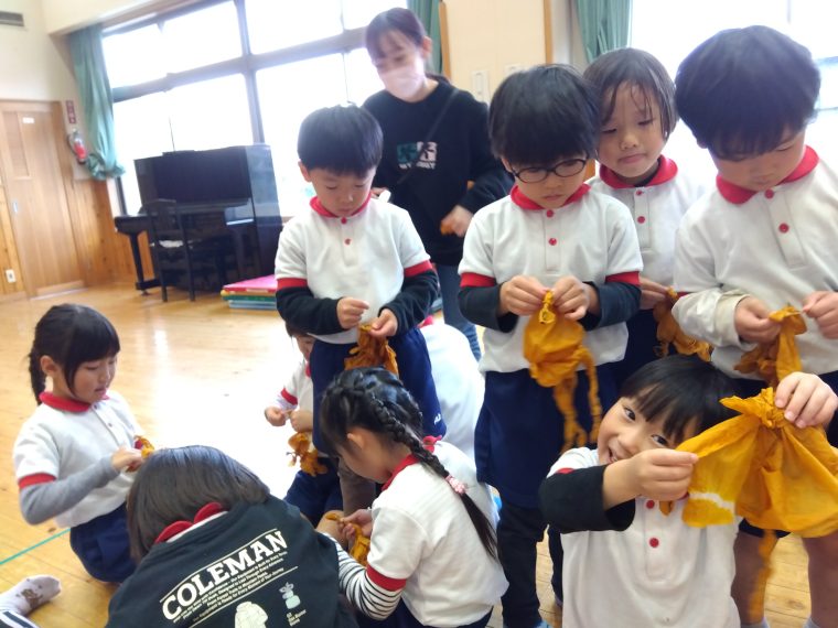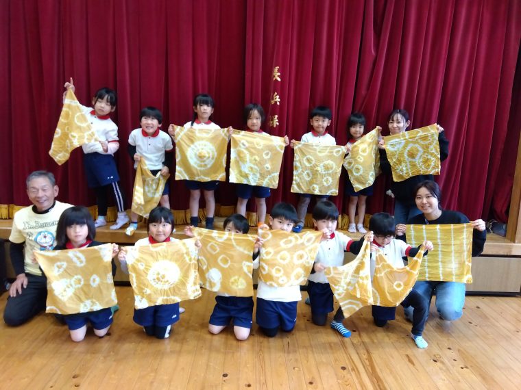 染料の材料に玉ねぎの皮が使用されてあり“何色になるかな?”と話をされた時は自身が着用されていた黄色のお洋服を見せ「こんな色の黄色だよ」と子ども達にも判りやすく話していただきました。