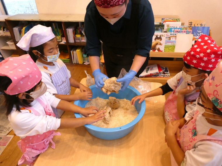 今年も、ふるさと先生(JAさがみどり地区オリーブの会の方)と一緒に、年長さんが味噌作りを行いました。