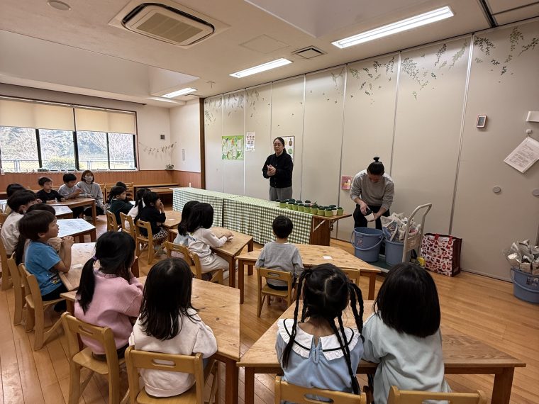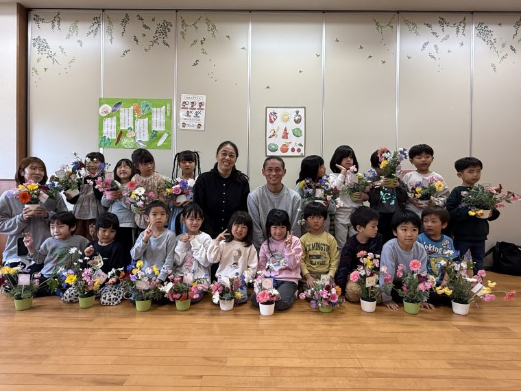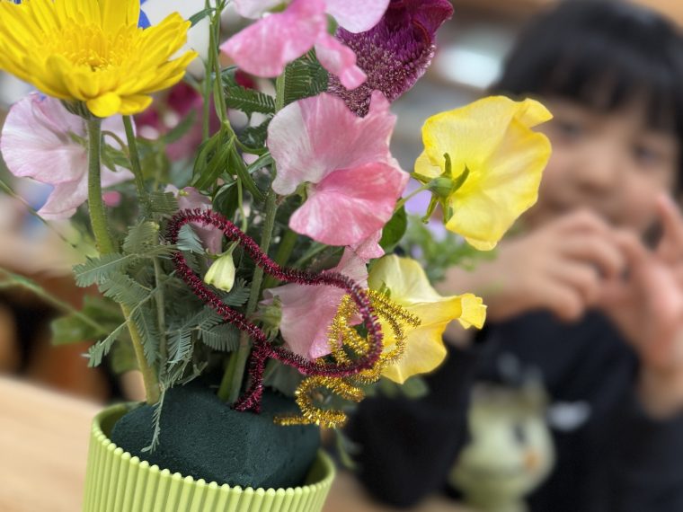 ふるさと先生によるフラワーアレンジメント体験でした。 お花の名前や、お花を大事にしながら茎を切る方法を教えてもらいながら体験しましたよ。