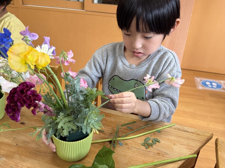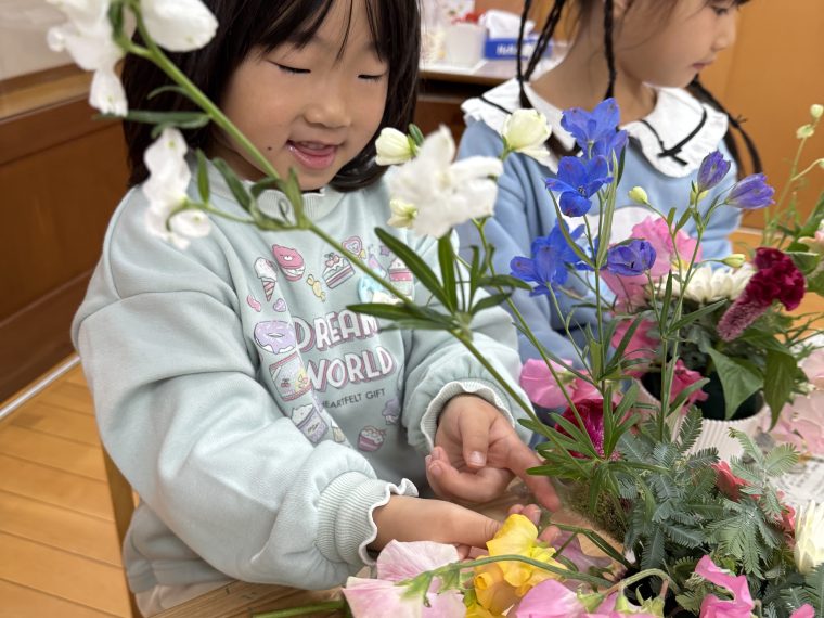 お花のいい香りに包まれながら、それぞれ思い思いにアレンジしていっていました♪