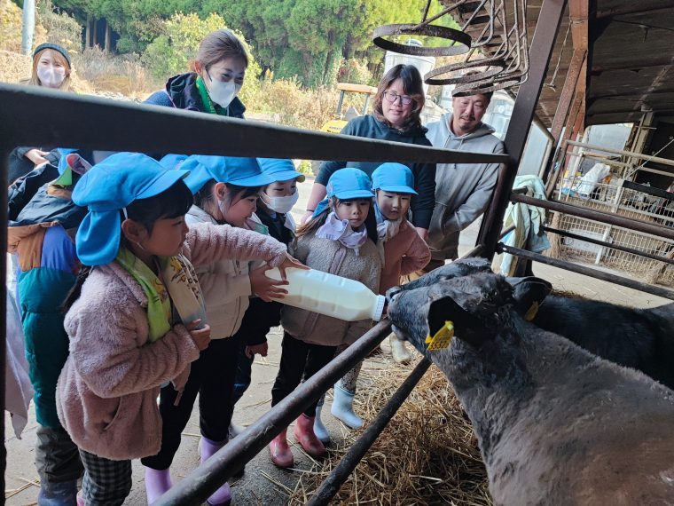 牛舎内の通路を歩き、実際に大きい親牛と対面した時は少し怖がる様子もありましたが、子牛さんの柵に近づくと「かわいい~!」と自ら積極的に頭をよしよしとなでてみたり、哺乳瓶での授乳をさせてもらったりととても貴重な体験の日となりました。