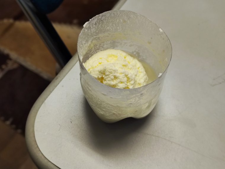 お話を聞いてお勉強したら、次はいよいよバター作り体験です。生クリームをペットボトルに入れ、ひたすらシェイク!!まさかたったそれだけでバターができるだなんて思っていなかった子どもたち、信じているのかそうでないのか・・・とにかく飛んだりはねたり走ったりしながらも一生懸命に振りに振って約30分・・・最初にできたのは一緒に参加なさっていた保護者さんでした。それを見た子どもたちの表情は本当に驚いた様子でしたが、これで疑心は確信に変わったようでみんなそこからもうひと踏ん張り、なんとかみんなバターを作ることができました。