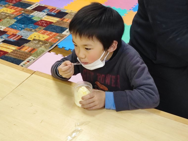 そしてお楽しみの実食♪食べてみると「おいし~♡」と手が止まらないほど!よっぽど美味しかったのか「おうちでまた作ろうね~」と親子で話す姿も見られました。