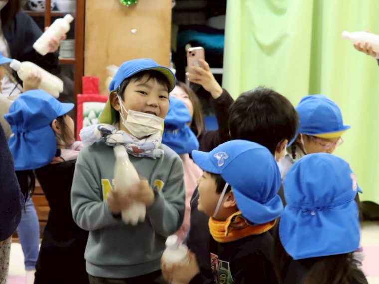 まずは酪農や牛についてのお話を聞き、赤ちゃん牛でもすでに自分たちよりも大きいんだ!ということに驚き、牛のお母さんは1日に牛乳パック26本分ものお乳を出すということにも更に驚きました。そしてみんながいつも飲んでいる牛乳は実は魔法の飲み物で、プリンやチーズ、ヨーグルトなど多様に変身できる物だということも子ども達には驚くポイントだったようです!