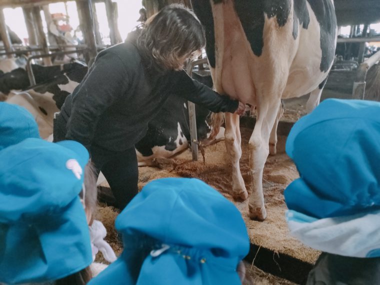 まずは酪農や牛についてのお話を聞き、赤ちゃん牛でもすでに自分たちよりも大きいんだ!ということに驚き、牛のお母さんは1日に牛乳パック26本分ものお乳を出すということにも更に驚きました。そしてみんながいつも飲んでいる牛乳は実は魔法の飲み物で、プリンやチーズ、ヨーグルトなど多様に変身できる物だということも子ども達には驚くポイントだったようです!