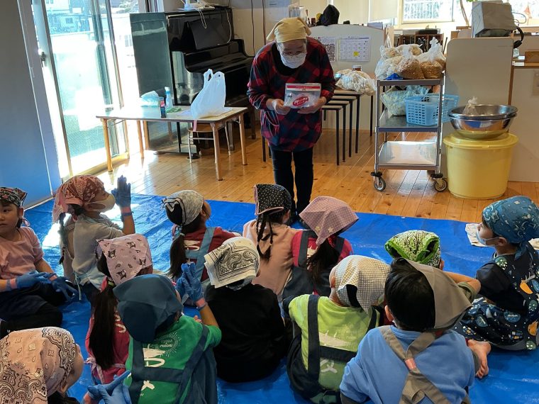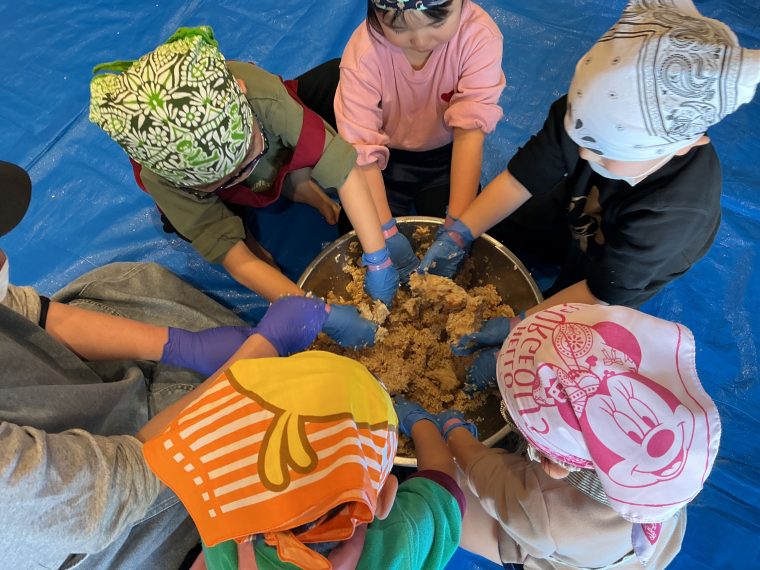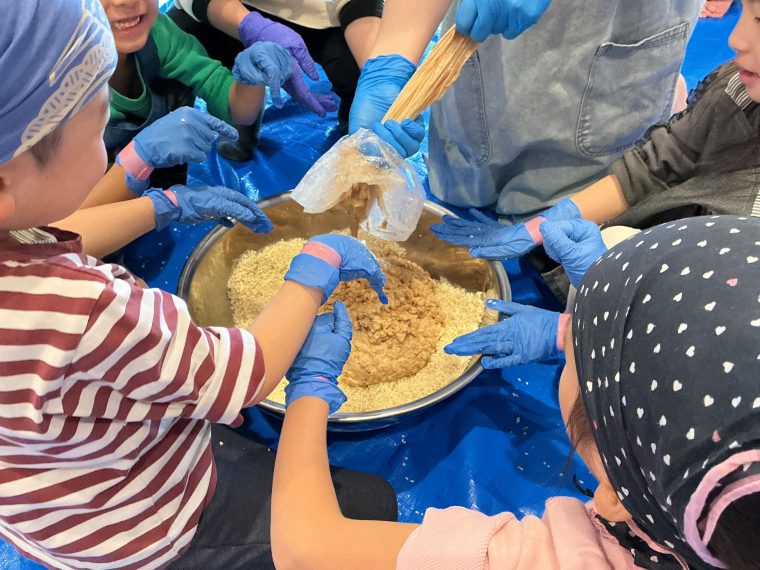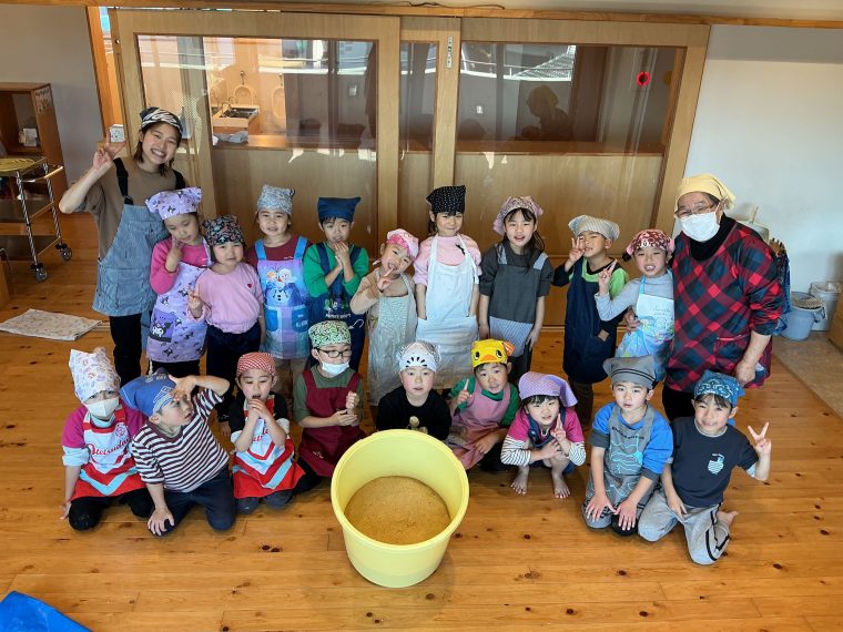 卒園記念の味噌作りでした。麹や塩、大豆の触感や香りを感じながら、味噌が出来上がっていく様子を楽しんでいました。
