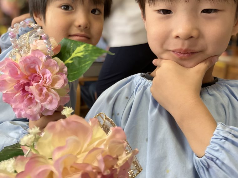 お互いに見せ合い、笑顔で言葉を交わしています。就学を控え、残り少ない園生活ですが、一日一日を大切に過ごしていきたいです。また、今回のコサージュ作りを通して、「卒園式」が大切な日と気付けた子どもたちでした。向井先生。ありがとうございました。