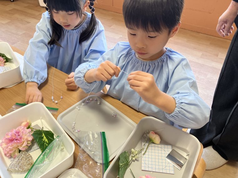大きさの違う花やリボン、ビーズを組み合わせていきます。両手をうまく使っています。