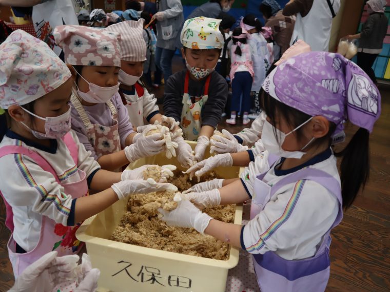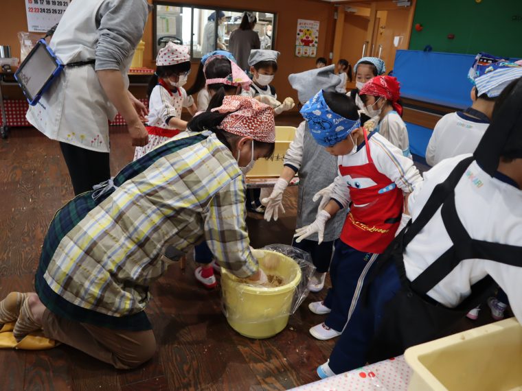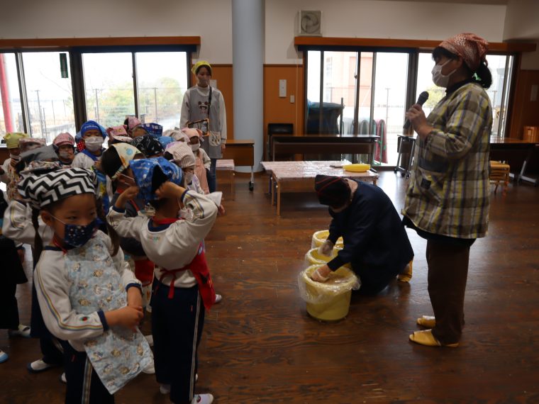 ふるさと先生と一緒に、「おいしくな~れ!」とおまじないをかけて味噌を寝かせました