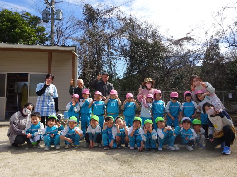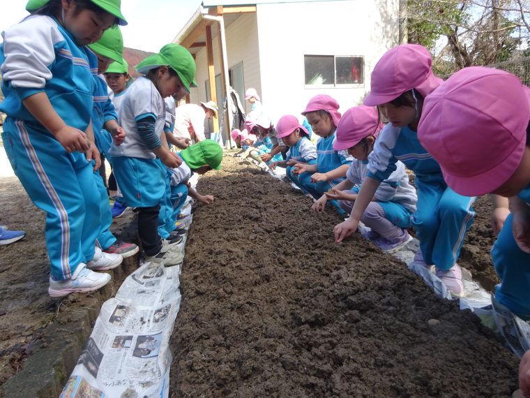 2月26日にふるさと先生(宮島先生)とじゃが芋種を植えました。じゃが芋の芽がでているほうを上にしてから早く芽が出るように温かくなるマルチを張り終わりました。カレーの中のじゃが芋を思い出して「おいしいお芋になってね。」とみんなで大きな声で言いました。6月頃の収穫が楽しみです。