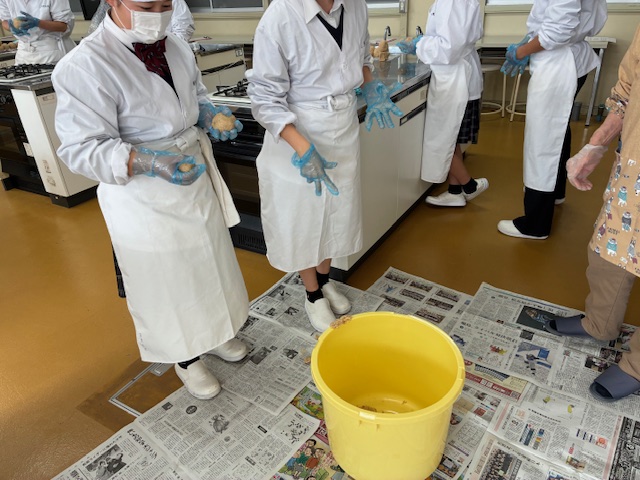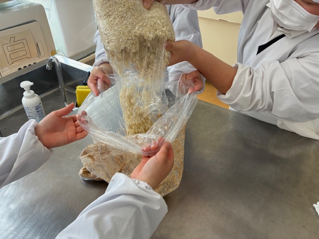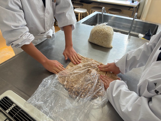 生徒たちは大豆の香りや大豆の状態の変化を感じながら、袋に入った大豆をつぶす作業に取り組みました。