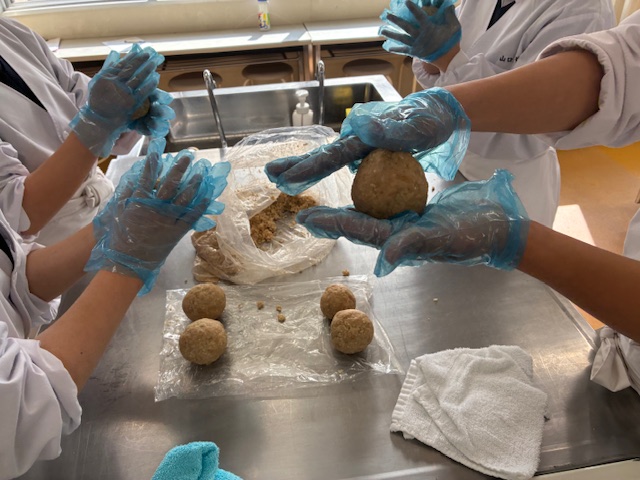 講師の岩永先生から大豆や味噌、発酵食についてお話を聞き、味噌作りを体験しました。